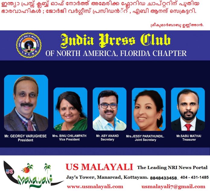 ഫ്ലോറിഡ: അമേരിക്കൻ മലയാളികളുടെ മാധ്യമ കൂട്ടായ്മയായ ഇന്ത്യാ പ്രസ്സ് ക്ലബ്ബ് ഓഫ് നോർത്ത് അമേരിക്ക , ഫ്ലോറിഡ ചാപ്റ്റർ ഭാരവാഹികളെ തെരഞ്ഞെടുത്തു. മാധ്യമ പ്രവർത്തകനും , സാംസ്കാരിക സാമൂഹിക രംഗത്ത് സജീവമായ ജോർജി വർഗ്ഗീസ് നയിക്കുന്ന കമ്മറ്റിയിൽ വൈസ് പ്രസിഡൻ്റ് ബിനു ചിലമ്പത്ത് , സെക്രട്ടറി എബി ആനന്ദ് , ജോ. സെക്രട്ടറി ജെസി പാറത്തുണ്ടിൽ , ട്രഷറർ സാബു മത്തായി എന്നിവരെ തെരഞ്ഞെടുത്തു.