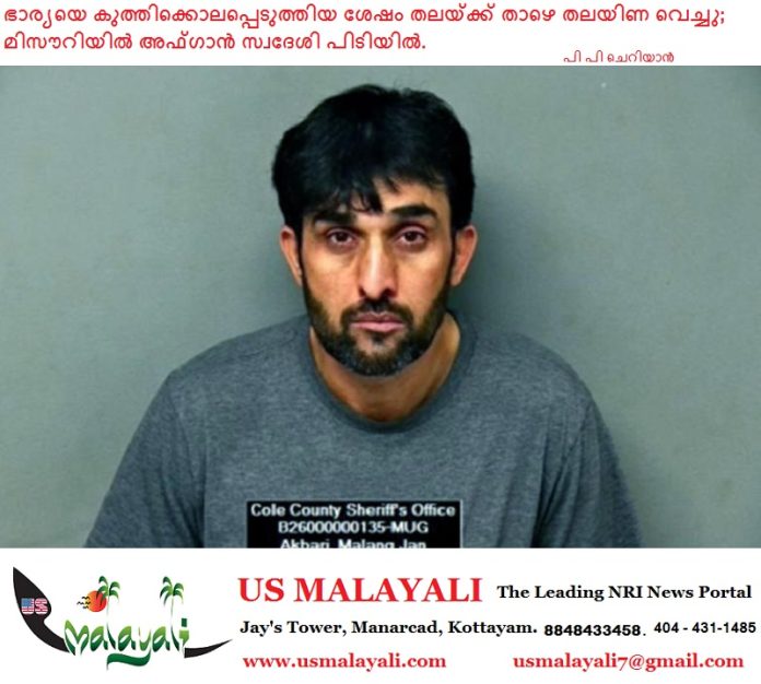 ജെഫേഴ്സൺ സിറ്റി: അമേരിക്കയിലെ മിസൗറിയിൽ സംശയത്തെത്തുടർന്ന് ഭാര്യയെ കുത്തിക്കൊലപ്പെടുത്തിയ 46-കാരനായ മലംഗ് ജാൻ അക്ബരിയെ പോലീസ് അറസ്റ്റ് ചെയ്തു. കൊലപാതകത്തിന് ശേഷം രക്തം വാർന്ന് കിടന്ന ഭാര്യയുടെ തലയ്ക്ക് താഴെ ഇയാൾ തലയിണ വെച്ചുകൊടുത്തതായും കോടതി രേഖകൾ വ്യക്തമാക്കുന്നു.