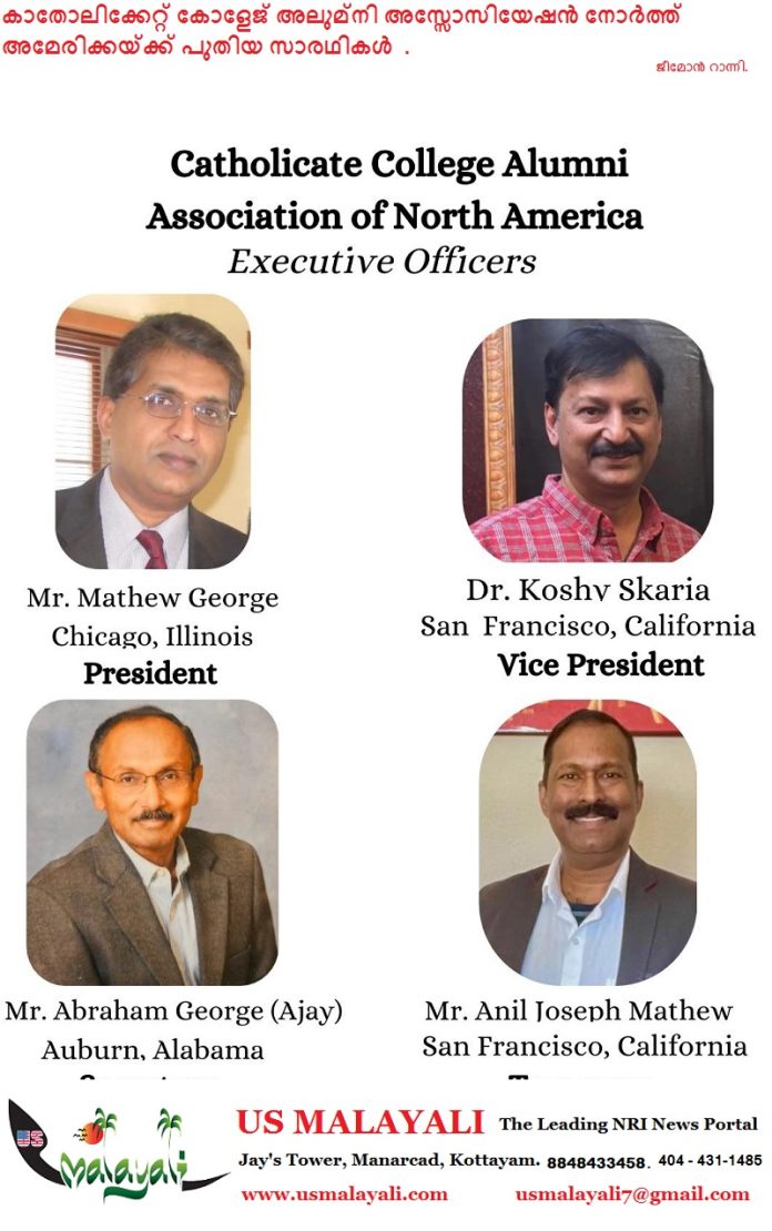 മാത്യു ജോർജ് , ഷിക്കാഗോ (പ്രസിഡണ്ട് ) കോശി സ്കറിയ, സാൻഫ്രാൻസിസ്കോ (വൈസ് പ്രസിഡണ്ട് ) ഏബ്രഹാം ജോർജ്, അലബാമ (സെക്രട്ടറി) അനിൽ ജോസഫ് മാത്യു,സാൻഫ്രാൻസിസ്കോ ( ട്രഷറർ)