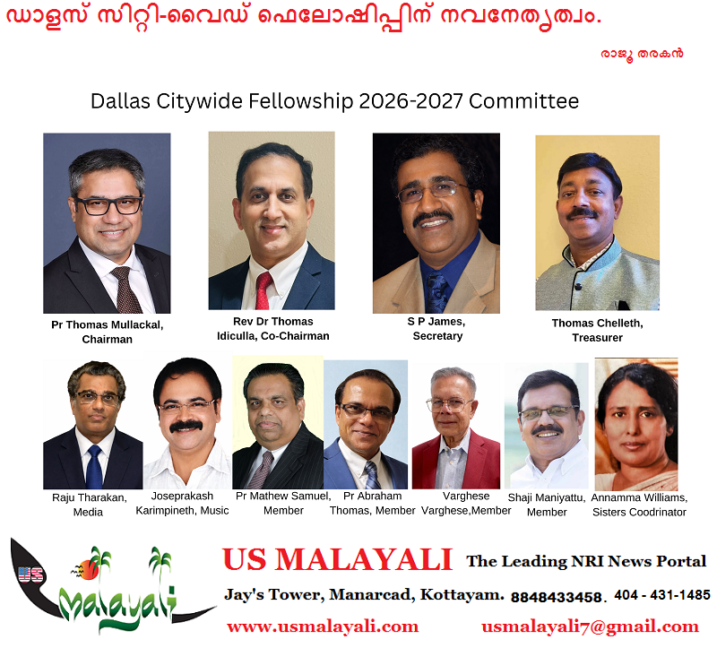 ഡാളസ്: ഡാളസ് പട്ടണത്തിലെ മലയാളി പെന്തക്കോസ്തൽ സഭകളുടെ ഐക്യവേദിയായ ഡാളസ് സിറ്റി-വൈഡ് ഫെലോഷിപ്പിന്റെ ചെയർമാനായി പാസ്റ്റർ തോമസ് മുല്ലയ്ക്കലും കോ-ചെയർമാനായി ഡോ. തോമസ് ഇടിക്കുളയും സെക്രട്ടറിയായി എസ് പി ജെയിംസും ട്രെഷററായി തോമസ് ചെല്ലേത്തും തിരഞ്ഞെടുക്കപ്പെട്ടു. ഇക്കഴിഞ്ഞ നവംബർ 15-ന് ഡാളസിൽ കൂടിയ പൊതുയോഗത്തിൽ വച്ചാണ് 2026-2027 വർഷത്തേക്കുള്ള പുതിയ ഭാരവാഹികളെ തിരഞ്ഞെടുത്തത്. കഴിഞ്ഞ എട്ടുവർഷങ്ങളിലായി സിറ്റി-വൈഡ് ഫെലോഷിപ്പിന് നേതൃത്വം നൽകിയ പാസ്റ്റർ മാത്യു ശാമുവലിന്റെ പ്രവർത്തനങ്ങളെ യോഗം അനുസ്മരിക്കുകയുണ്ടായി.