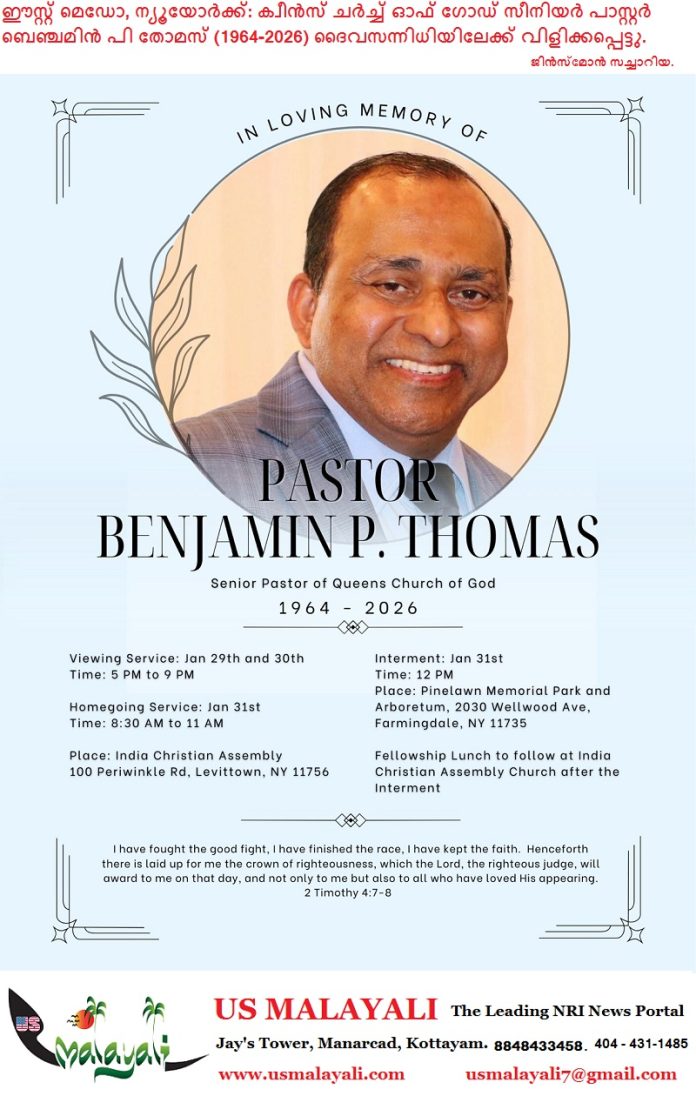 ഈസ്റ്റ് മെഡോ, ന്യൂയോര്ക്ക്: ക്വീന്സ് ചര്ച്ച് ഓഫ് ഗോഡ് സീനിയര് പാസ്റ്റര് ബെഞ്ചമിന് പി തോമസ്