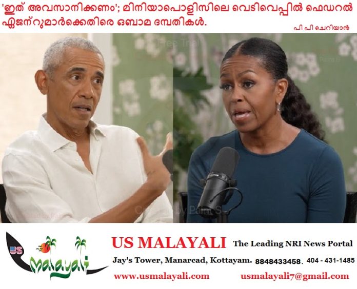 മിനിയാപൊളിസ്: അമേരിക്കയിലെ മിനിയാപൊളിസിൽ ഐസിഇ ഏജന്റുമാരുടെ നടപടിക്കിടയിൽ നഴ്സ് വെടിയേറ്റു മരിച്ച സംഭവത്തിൽ കടുത്ത പ്രതിഷേധവുമായി മുൻ പ്രസിഡന്റ് ബരാക് ഒബാമയും മിഷേൽ ഒബാമയും രംഗത്തെത്തി. ഫെഡറൽ ഏജന്റുമാരുടെ അക്രമാസക്തമായ നടപടികൾ അവസാനിപ്പിക്കണമെന്നും രാജ്യത്തിന്റെ അടിസ്ഥാന മൂല്യങ്ങൾ ആക്രമിക്കപ്പെടുകയാണെന്നും അവർ പ്രസ്താവനയിൽ പറഞ്ഞു.