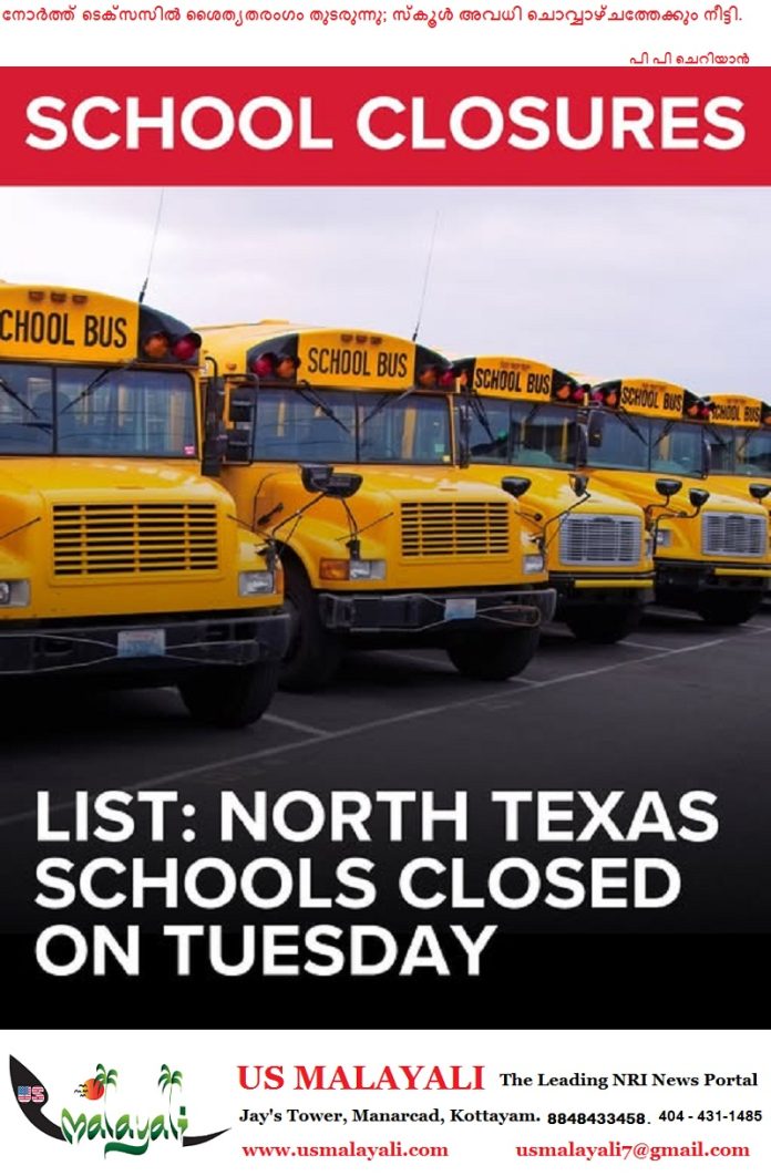 ടെക്സാസ് :നോർത്ത് ടെക്സസിൽ ശൈത്യകാല കാലാവസ്ഥയും മഞ്ഞുവീഴ്ചയും തുടരുന്ന സാഹചര്യത്തിൽ, പ്രദേശത്തെ സ്കൂളുകൾക്ക് ചൊവ്വാഴ്ചയും അവധി പ്രഖ്യാപിച്ചു. റോഡുകളിലെ മഞ്ഞുപാളികളും താഴ്ന്ന താപനിലയും യാത്രാതടസ്സമുണ്ടാക്കുന്നതിനാലാ