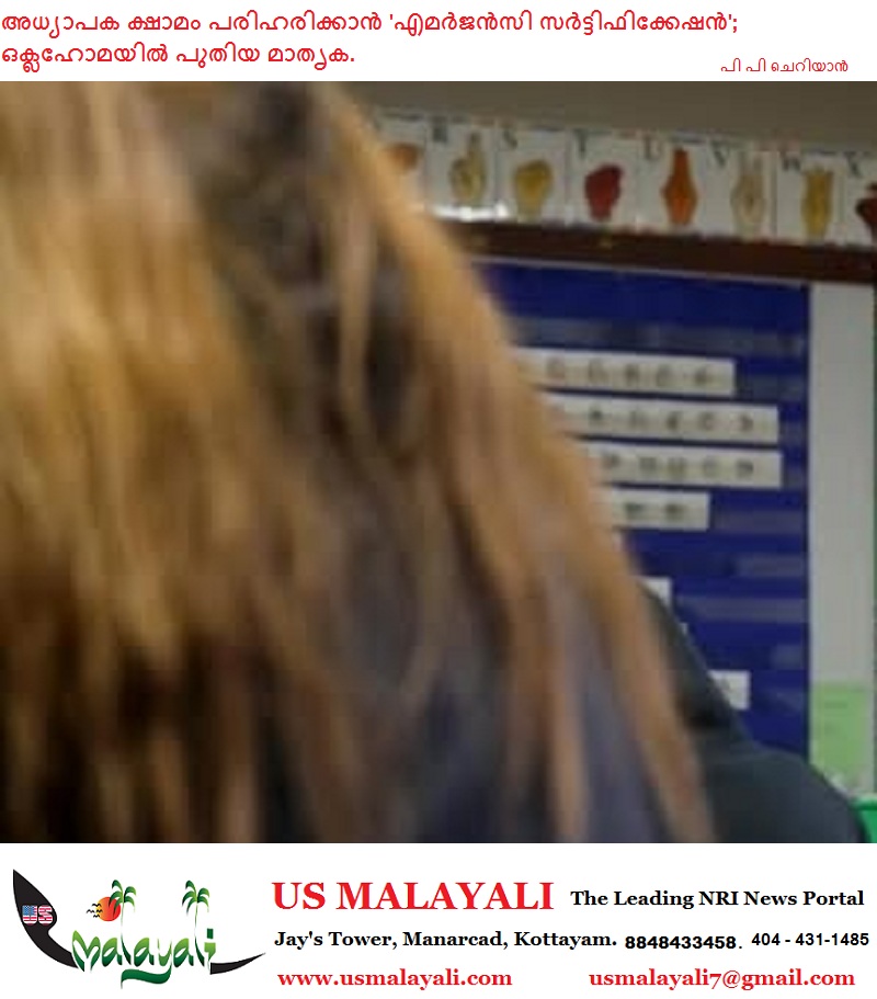 ഒക്ലഹോമ: ഒക്ലഹോമയിൽ നിലനിൽക്കുന്ന രൂക്ഷമായ അധ്യാപക ക്ഷാമം നേരിടാൻ ‘എമർജൻസി സർട്ടിഫൈഡ്’ അധ്യാപകരുടെ എണ്ണം വർധിപ്പിക്കുന്നു. കഴിഞ്ഞ അഞ്ച് വർഷത്തിനിടെ 20,000-ത്തിലധികം പേരെയാണ് ഇത്തരത്തിൽ നിയമിച്ചത്.