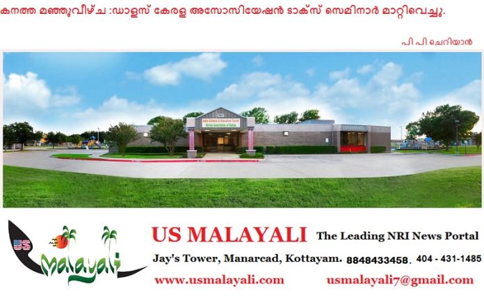ഡാളസ്: കനത്ത മഞ്ഞുവീഴ്ചയെയും മോശം കാലാവസ്ഥയെയും തുടർന്ന് ഡാളസ് കേരള അസോസിയേഷനും (KAD) ഇന്ത്യ കൾച്ചറൽ ആൻഡ് എജ്യുക്കേഷൻ സെന്ററും (ICEC) സംയുക്തമായി നടത്താനിരുന്ന വാർഷിക ടാക്സ് സെമിനാർ മാറ്റിവെച്ചു. ജനുവരി 31 ശനിയാഴ്ച നടക്കേണ്ടിയിരുന്ന പരിപാടിയാണ് സുരക്ഷാ കാരണങ്ങളാൽ മാറ്റി നിശ്ചയിച്ചത്.
