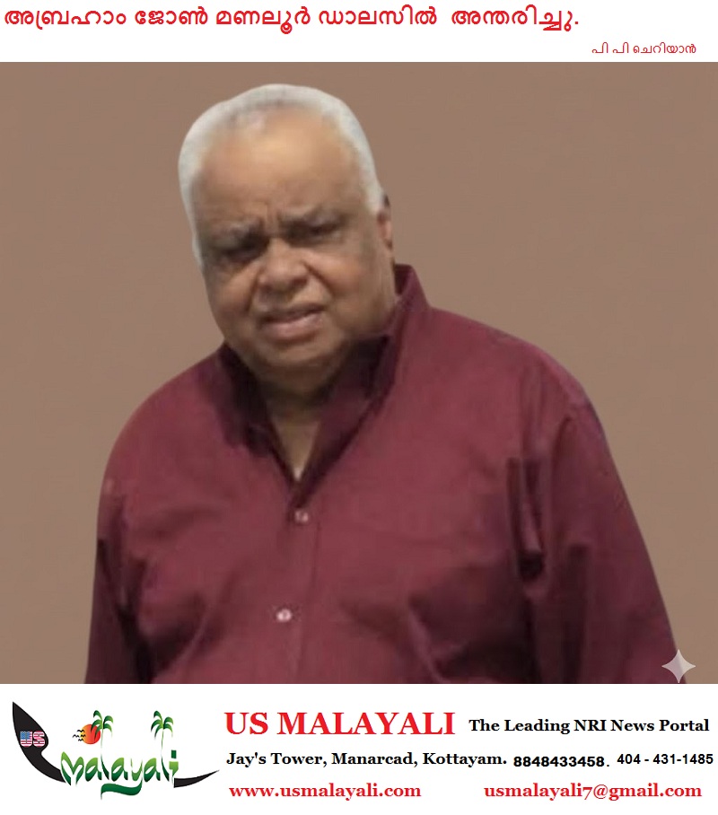 ഡാളസ് (ടെക്സാസ് ): മണലൂർ കുടുംബാംഗം അബ്രഹാം ജോൺ മണലൂർ (85) ഡാലസിൽ അന്തരിച്ചു വാർദ്ധക്യസഹജമായ കാരണങ്ങളാൽ 2026 ജനുവരി 30 വെള്ളിയാഴ്ചയായിരുന്നു അന്ത്യം.ഡാളസ് സെഹിയോൻ മാർത്തോമാ ചർച് അംഗമാണ്