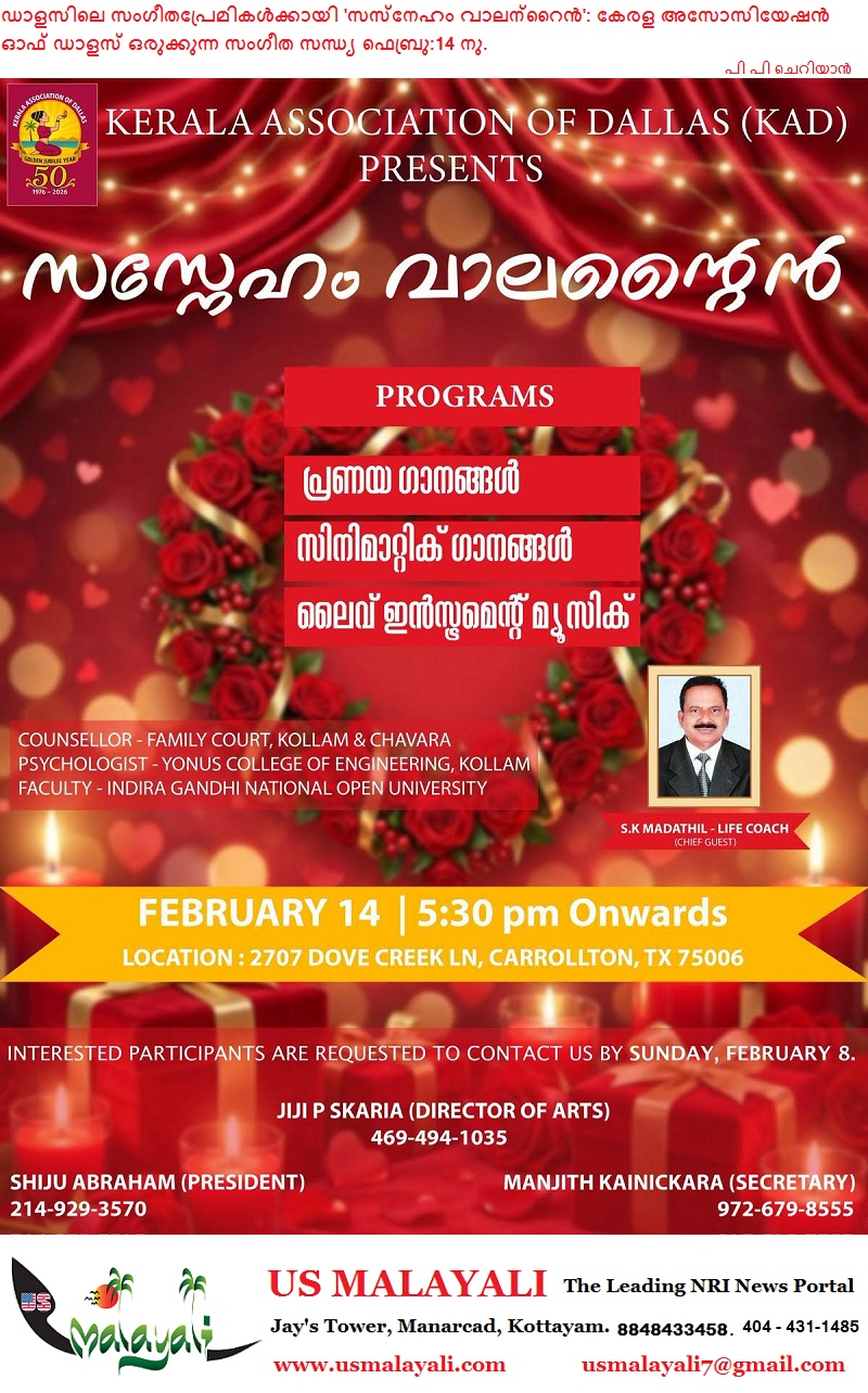 ഡാളസിലെ സംഗീതപ്രേമികൾക്കായി കേരള അസോസിയേഷൻ ഓഫ് ഡാളസ് ‘സസ്നേഹം വാലന്റൈൻ’ എന്ന പേരിൽ സംഗീത വിരുന്ന് സംഘടിപ്പിക്കുന്നു. പ്രണയവും സൗഹൃദവും സംഗീതവും കോർത്തിണക്കി ഫെബ്രുവരി 14-നാണ് പരിപാടി നടക്കുന്നത്.