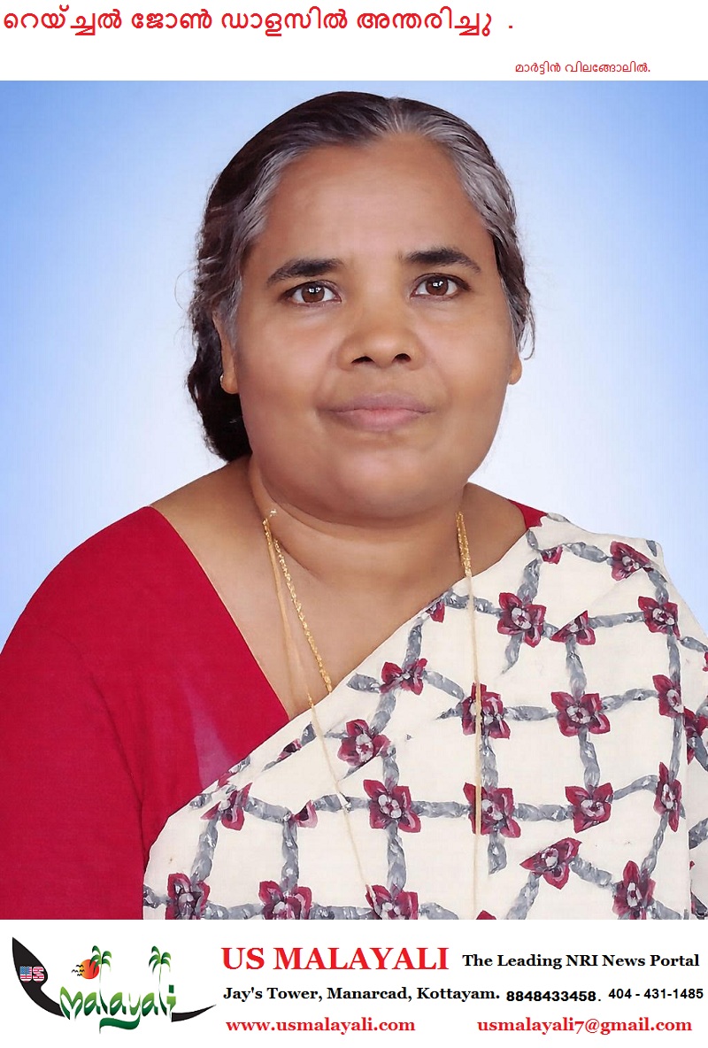 ഡാളസ് : കോഴഞ്ചേരി വെട്ടൊലിൽ വീട്ടിൽ പരേതനായ വർഗീസ് ജോണിന്റെ ഭാര്യ റെയ്ച്ചൽ ജോൺ (89 വയസ്സ്) ഡാളസിൽ അന്തരിച്ചു. പരേത കുഴിക്കാല ചരുവുപറമ്പിൽ കുടുംബാംഗമാണ്.