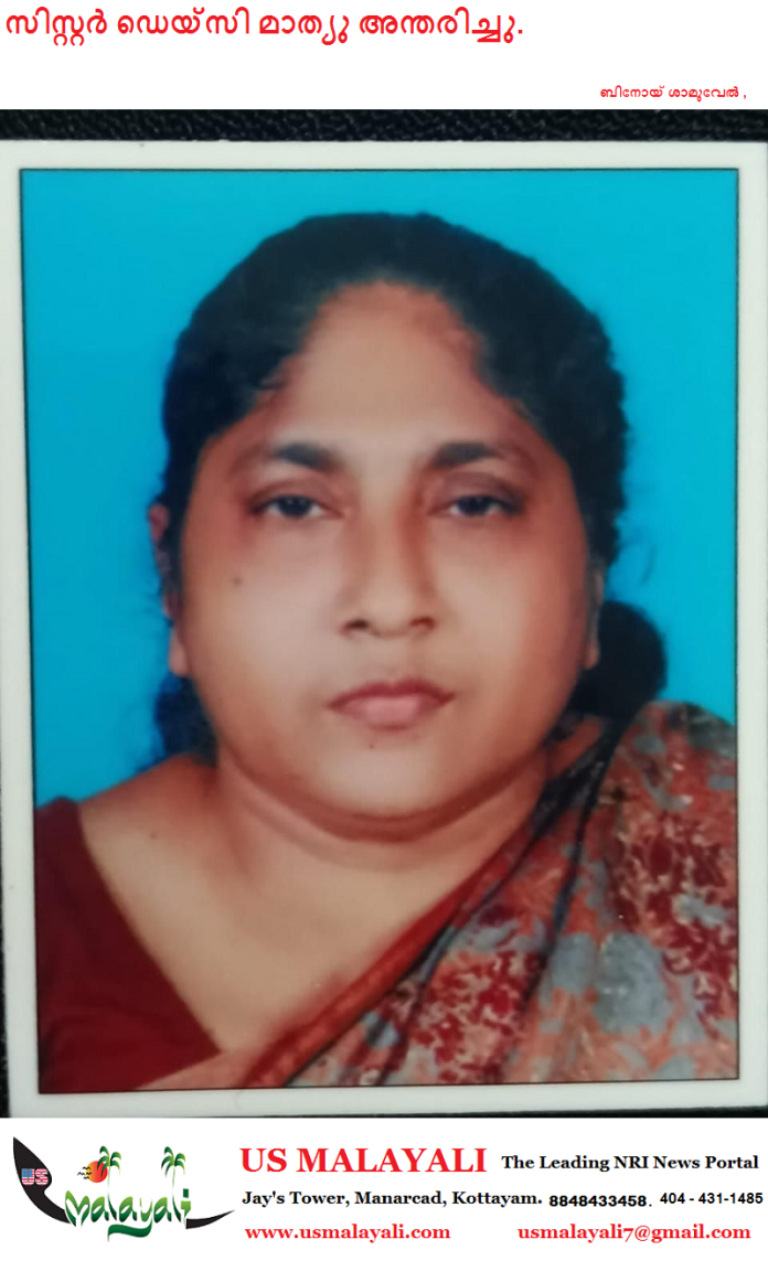 ഡാളസ് /ഓതറ: താന്നിക്കൽ പരേതനായ ടി.ഡി. ജോണിന്റെ മകളും, കണ്ടത്തിൽ ബ്രദർ കെ.വി. മാത്യുവിന്റെ (മോനി) ഭാര്യയുമായ സിസ്റ്റർ ഡെയ്സി മാത്യു (64) അന്തരിച്ചു. ഫെബ്രുവരി 2-ന് രാവിലെ 8:30-നായിരുന്നു അന്ത്യം.