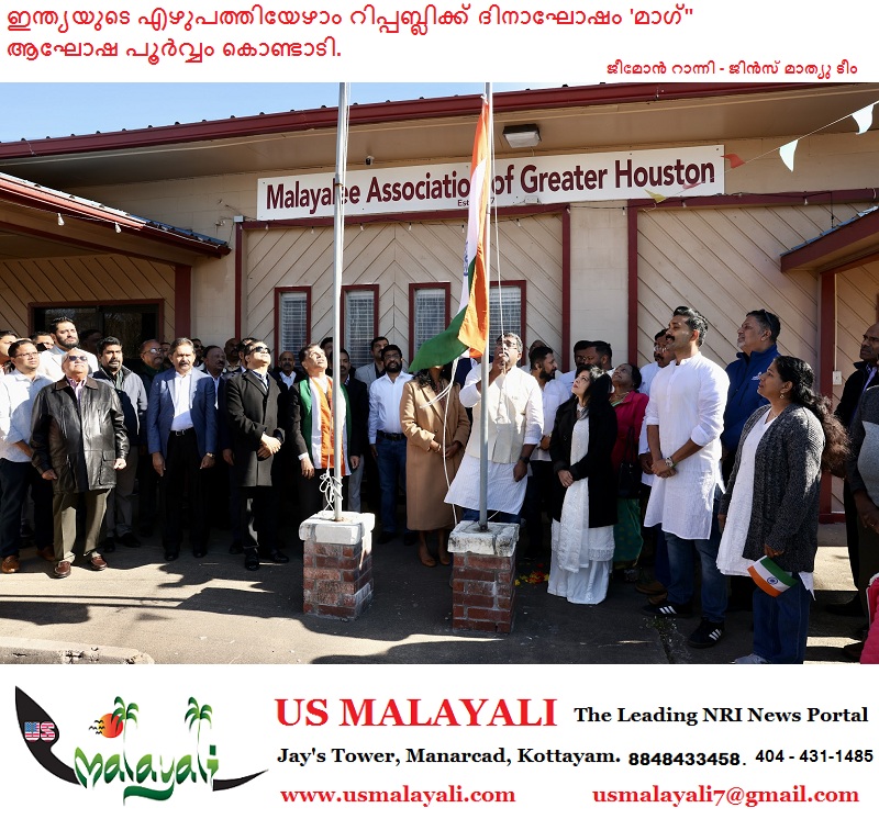 ഹൂസ്റ്റൺ:മാത്യ രാജ്യത്തിൻ്റെ സ്നേഹവും ബഹുമാനവും പ്രതിഫലിപ്പിച്ച് കൊണ്ട് നോർത്ത് അമേരിക്കയിലെ ഏറ്റവും വലിയ മലയാളി അസോസിയേഷനായ മലയാളി അസോസിയേഷൻ ഓഫ് ഗ്രേറ്റർ ഹൂസ്റ്റൺ [മാഗ്] ആസ്ഥാന മന്ദിരമായ കേരള ഹൗസിൽ ഭാരതത്തിൻ്റെ എഴുപത്തിയേഴാം റിപ്പബ്ബിക്ക് ദിനം ആഘോഷപൂർവം കൊണ്ടാടി.