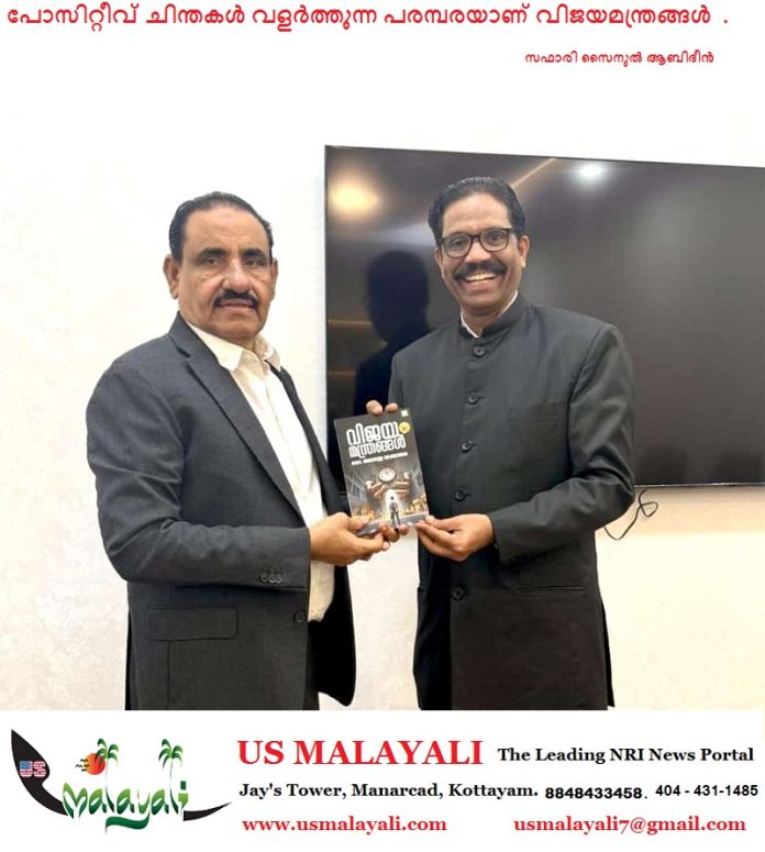 ജീവിതത്തില് സാന്ദ്രമായ ചിന്തകളും നിര്മാണാത്മകമായ സമീപനങ്ങളും വളര്ത്തുന്നതില് ‘വിജയമന്ത്രങ്ങള്’ എന്ന പ്രചോദന പരമ്പര നിര്ണായക പങ്ക് വഹിക്കുന്നതായി സഫാരി ഗ്രൂപ്പ് ഓഫ് കമ്പനീസ് ഡെപ്യൂട്ടി ചെയര്മാനും മാനേജിംഗ് ഡയറക്ടറുമായ സൈനുല് ആബിദീന് അഭിപ്രായപ്പെട്ടു.
