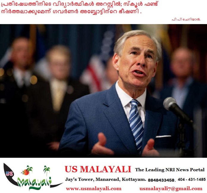 ടെക്സാസ് :ടെക്സസിലെ കൈലിൽ നടന്ന ഐസ് വിരുദ്ധ പ്രതിഷേധത്തിനിടെ രണ്ട് വിദ്യാർത്ഥികളെ അറസ്റ്റ് ചെയ്ത നടപടിയെ അനുകൂലിച്ച് ഗവർണർ ഗ്രെഗ് അബ്ബോട്ട്. പഠനം തടസ്സപ്പെടുത്തിയുള്ള ഇത്തരം പ്രതിഷേധങ്ങൾക്ക് അനുമതി നൽകുന്ന സ്കൂളുകളുടെ ഫണ്ട് വെട്ടിക്കുറയ്ക്കുമെന്നും അദ്ദേഹം മുന്നറിയിപ്പ് നൽകി.