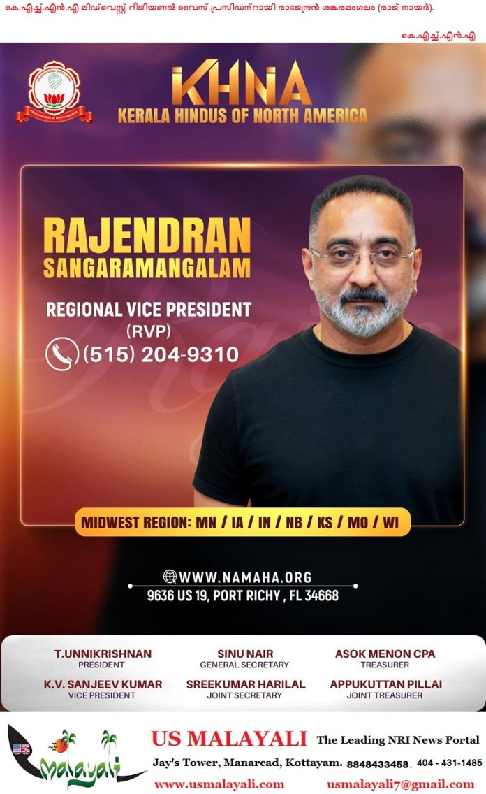 നോർത്ത് അമേരിക്കയിലെ മലയാളി ഹിന്ദുക്കളുടെ ദേശീയ സംഘടനയായ **Kerala Hindus of North America (KHNA)**യുടെ മിഡ്വെസ്റ്റ് റീജിയണൽ വൈസ് പ്രസിഡന്റായി (RVP) രാജേന്ദ്രൻ ശങ്കരമംഗലം (രാജ് നായർ) നിയമിതനായി. മിന്നസോട്ട, ഐവ, ഇൻഡിയാന, നെബ്രാസ്ക, കാൻസസ്, മിസൗറി, വിസ്കോൺസിൻ എന്നീ സംസ്ഥാനങ്ങൾ ഉൾപ്പെടുന്ന മിഡ്വെസ്റ്റ് മേഖലയിലെ സംഘടനാ പ്രവർത്തനങ്ങൾ ഏകോപിപ്പിക്കുകയും സാമൂഹിക–സാംസ്കാരിക പ്രവർത്തനങ്ങൾക്ക് നേതൃത്വം നൽകുകയും ചെയ്യുന്നതാണ് അദ്ദേഹത്തിന്റെ പ്രധാന ചുമതല.