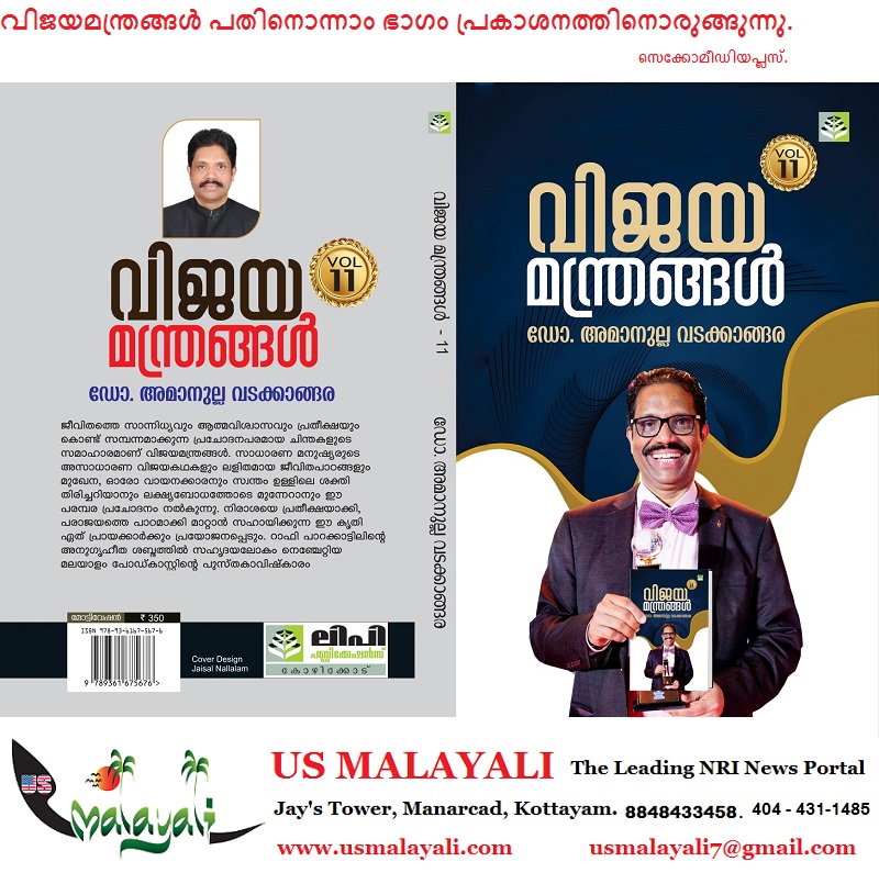 ദോഹ. ഡോ.അമാനുല്ല വടക്കാങ്ങരയുടെ മോട്ടിവേഷണല് പരമ്പരയായ വിജയമന്ത്രങ്ങള് പതിനൊന്നാം ഭാഗം പ്രകാശനത്തിനൊരുങ്ങുന്നു. കോഴിക്കോട് കേന്ദ്രമായി പ്രവര്ത്തിക്കുന്ന ലിപി പബ്ളിക്കേഷന്സാണ് പ്രസാധകര്. ഡോ.അമാനുല്ല വടക്കാങ്ങരയുടെ നൂറ്റി ഒന്നാമത് പുസ്തകമാണിത്.