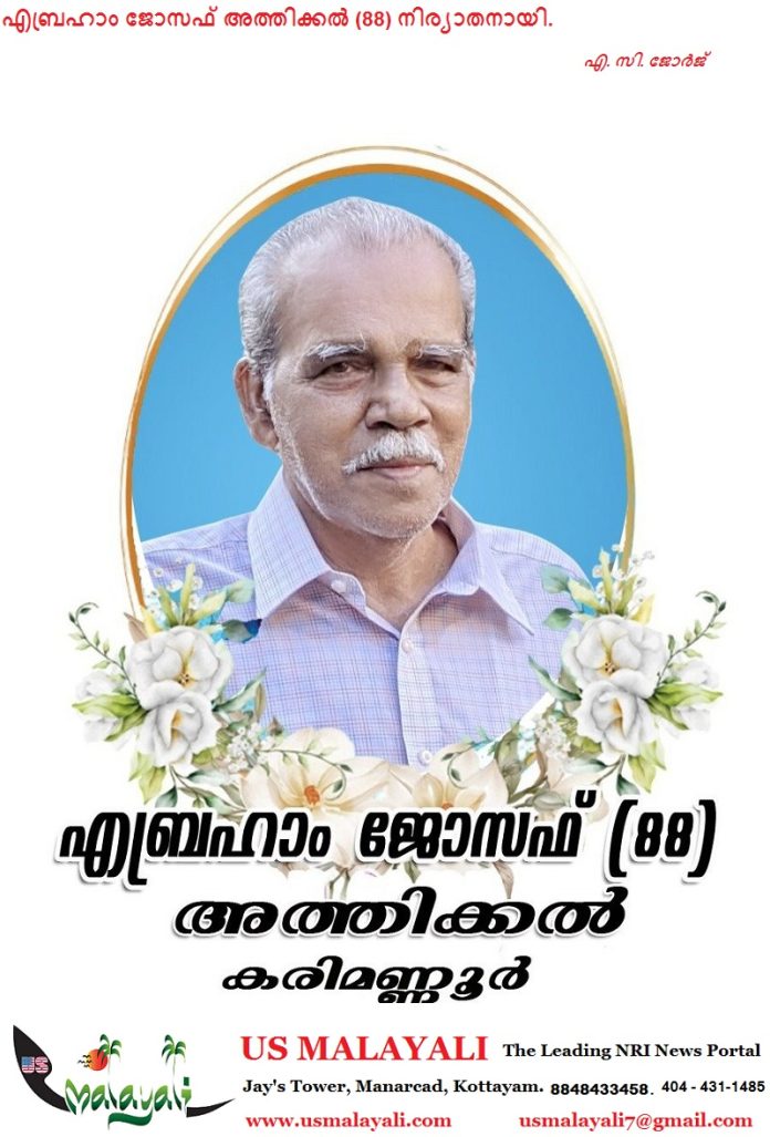 കരിമണ്ണൂർ: എബ്രഹാം ജോസഫ് അത്തിക്കൽ (88), (കരിമണ്ണൂർ – തൊടുപുഴ) സ്വവസതിയിൽ വച്ച് ഫെബ്രുവരി ഒമ്പതാം തിയതി നിര്യാതനായി. ഭാര്യ മേരി എബ്രഹാം കോലത്ത് കുടുംബാംഗമാണ്. കേരളത്തിലുണ്ടായിരുന്ന മകൻ ജോസൻ നേരത്തെ മരണപ്പെട്ടിരുന്നു. മറ്റു മക്കൾ: ഡീന (കേരള) ട്രീസാ, സ്റ്റെല്ല, സിസ്സി, എന്നീ മൂവരും ന്യൂയോർക്കിൽ ആണ്.