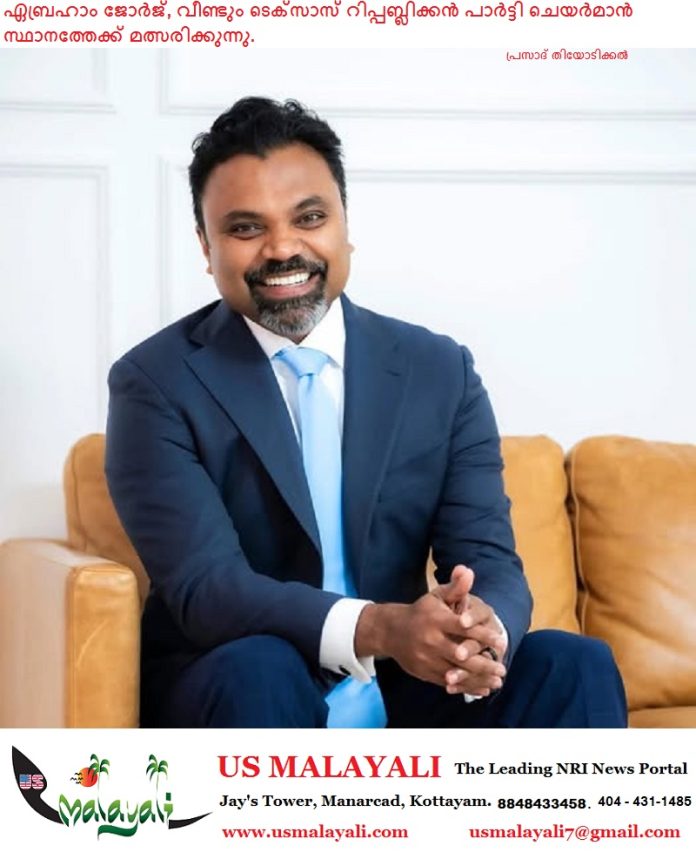ഓസ്റ്റിൻ(ടെക്സാസ്): റിപ്പബ്ലിക്കൻ പാർട്ടി ചെയർമാൻ ഏബ്രഹാം ജോർജ്, വീണ്ടും ചെയർമാൻ സ്ഥാനത്തേക്ക് മത്സരിക്കുന്നതായി ഔദ്യോഗികമായി പ്രഖ്യാപിച്ചു. തന്റെ നേതൃത്വകാലത്ത് കൈവരിച്ച പ്രധാന നിയമനിർമ്മാണ വിജയങ്ങളും പാർട്ടിയുടെ സംഘടനാപരമായ വളർച്ചയും അദ്ദേഹം ഈ പ്രഖ്യാപനത്തിൽ പ്രധാനമായി ചൂണ്ടിക്കാട്ടി.