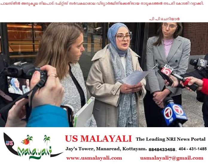മസാച്യുസെറ്റ്സ് :പാലസ്തീൻ അനുകൂല നിലപാട് സ്വീകരിച്ചതിന്റെ പേരിൽ ട്രംപ് ഭരണകൂടം തടങ്കലിലാക്കിയ ടഫ്റ്റ്സ് സർവകലാശാലയിലെ ഗവേഷക വിദ്യാർത്ഥിനി റുമൈസ ഓസ്തുർക്കിനെ നാടുകടത്താനുള്ള നീക്കം ഇമിഗ്രേഷൻ കോടതി തടഞ്ഞു. ഓസ്തുർക്കിനെ നാടുകടത്താൻ ആവശ്യമായ തെളിവുകൾ ഹാജരാക്കുന്നതിൽ ആഭ്യന്തര സുരക്ഷാ വകുപ്പ് പരാജയപ്പെട്ടുവെന്ന് ചൂണ്ടിക്കാട്ടിയാണ് കോടതി നടപടികൾ അവസാനിപ്പിച്ചത്.