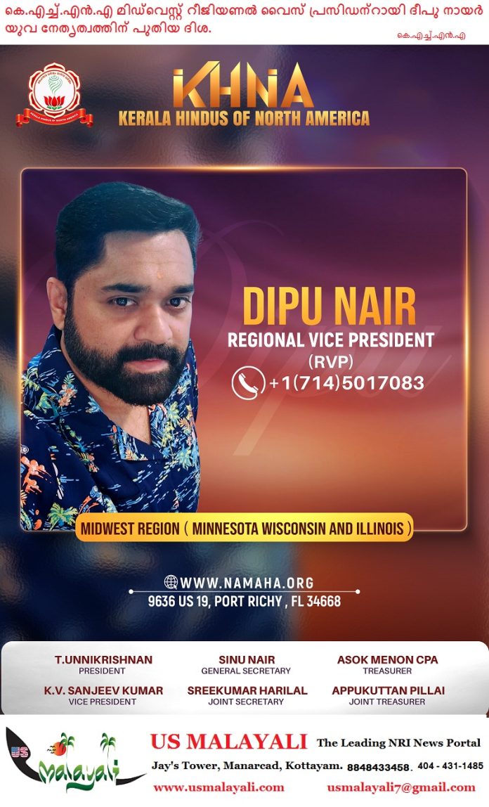 ചിക്കാഗോ : നോർത്ത് അമേരിക്കയിലെ മലയാളി ഹിന്ദുക്കളുടെ ദേശീയ സംഘടനയായ Kerala Hindus of North America (KHNA)യുടെ മിഡ്വെസ്റ്റ് റീജിയണൽ വൈസ് പ്രസിഡന്റായി (RVP) ദീപു നായരെ നിയമിച്ചു. മിന്നസോട്ട, വിസ്കോൺസിൻ, ഇലിനോയി എന്നിവ ഉൾപ്പെടുന്ന മിഡ്വെസ്റ്റ് മേഖലയിൽ KHNAയുടെ പ്രവർത്തനങ്ങൾക്ക് പുതുജീവൻ നൽകുകയും യുവതലമുറയെ കൂടുതൽ സജീവമായി സംഘടനയിലേക്ക് ആകർഷിക്കുകയും ചെയ്യുന്നതാണ് അദ്ദേഹത്തിന്റെ പ്രധാന ദൗത്യം.