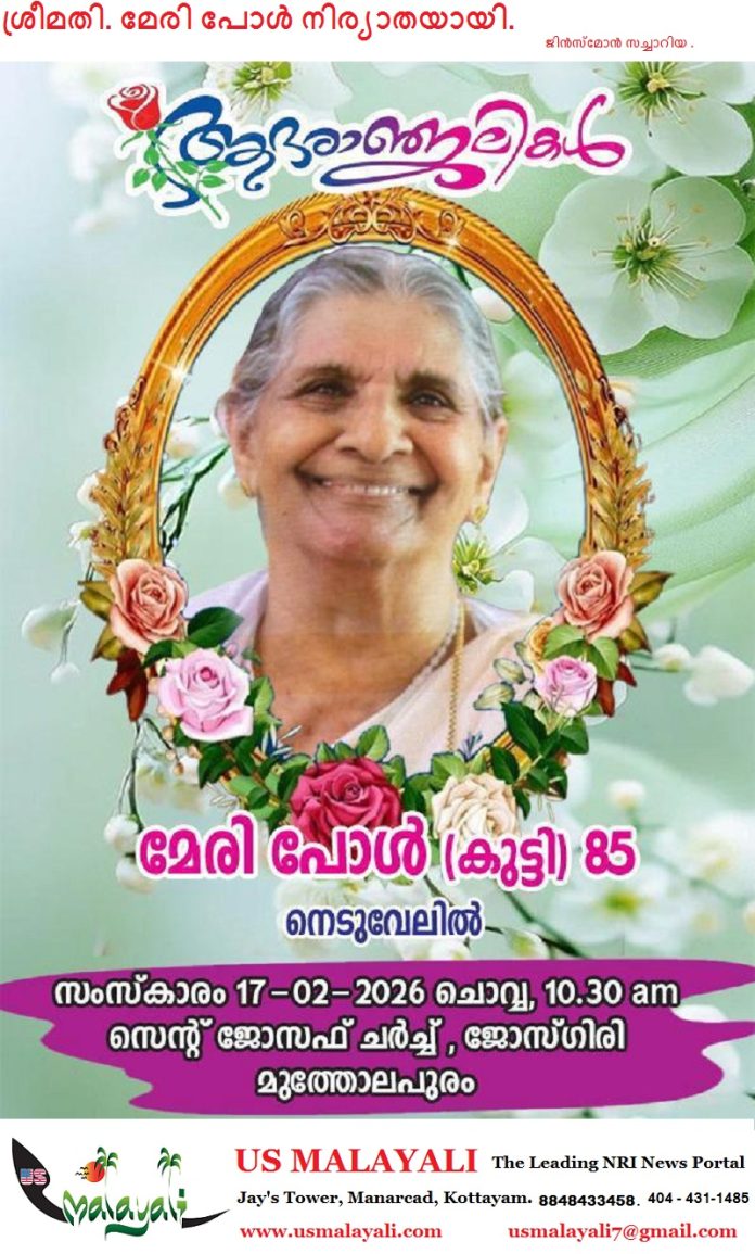 ദീപിക ദിനപത്രത്തിന്റെ മുൻ മാനേജിംഗ് ഡയറക്ടർ സുനിൽ ജോസഫ് കൂഴമ്പാല (ന്യൂയോർക്ക്)യുടെ സഹോദരി ശ്രീമതി. മേരി പോൾ (പരേതനായ പൈലി പോൾ, നെടു വേലിൽ) നിര്യാതയായി.