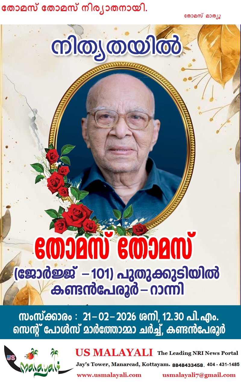 ഹൂസ്റ്റൺ: റാന്നി കൊറ്റനാട് പുതുക്കുടിയിൽ തോമസ് തോമസ് ( ജോർജ്, 101 വയസ്സ് ) നിര്യാതനായി. സംസ്കാരം ഫെബ്രുവരി 21 നു ശനിയാഴ്ച 12.30 നു കണ്ടൻപേരൂർ സെന്റ് പോൾസ് മാർത്തോമാ ദേവാലയത്തിൽ. അയിരൂർ അയ്യക്കാവിൽ കുടുംബാംഗമാണ്.ഭാര്യ കല്ലൂപ്പാറ മേലേക്കൂറ്റ് പരേതയായ ഏലിയാമ്മ.