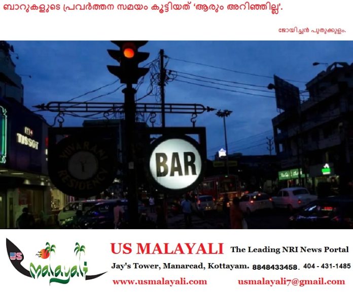 സംസ്ഥാനത്ത് ബാറുകളുടെ പ്രവർത്തന സമയം കൂട്ടിയത് മുന്നണിയിലും മന്ത്രിസഭയിലും ചർച്ച ചെയ്യാതെ. നയപരമായ മാറ്റം ചർച്ച ചെയ്യാത്തതിൽ എൽഡിഎഫിൽ വിമർശനം ശക്തമാണ്. എന്നാൽ മുന്നണി അംഗീകരിച്ച മദ്യനയത്തിൽ ഊന്നിയുള്ള തീരുമാനമെന്നാണ് എക്സൈസ് വകുപ്പിന്റെ വിശദീകരണം. ബാറുകളുടെ പ്രവർത്തനസമയം 2 മണിക്കൂർ കുട്ടിയായിരുന്നു സംസ്ഥാന സർക്കാർ ഉത്തരവിറക്കിയത്. നിയമസഭാതിരഞ്ഞെടുപ്പ് പടിവാതിൽക്കൽ നിൽക്കുമ്പോഴാണ് ബാർ ഉടമകളുടെ ദീർഘകാല ആവശ്യം സർക്കാർ സാധിച്ചു നൽകിയിരിക്കുന്നത്.