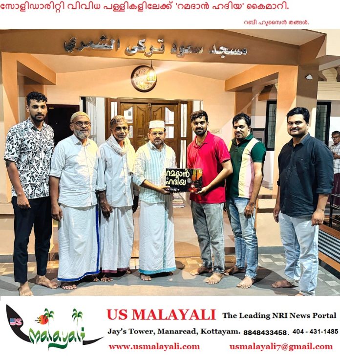 കൂട്ടിലങ്ങാടി : സോളിഡാരിറ്റി മക്കരപ്പറമ്പ ഏരിയ കമ്മിറ്റിയുടെ നേതൃത്വത്തിൽ ഏരിയയിലെ വിവിധ പള്ളികളിലേക്ക് ‘റമദാൻ ഹദിയ’ കൈമാറി. മക്കരപ്പറമ്പ് ഏരിയതല ഉദ്ഘാടനം പടിഞ്ഞാറ്റുമുറി മസ്ജിദുന്നൂർ മഹല്ല് സെക്രട്ടറി ഡോ മുബാറകിന് നൽകി ഏരിയ പ്രസിഡന്റ് ലബീബ് മക്കരപ്പറമ്പ് നിർവഹിച്ചു.