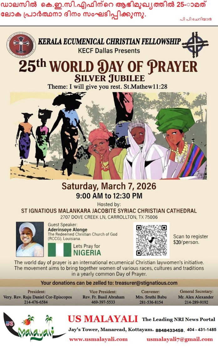 ഡാളസ് : കേരള എക്യുമെനിക്കൽ ക്രിസ്ത്യൻ ഫെല്ലോഷിപ്പ് ഡാലസിന്റെ ആഭിമുഖ്യത്തിൽ 25-ാമത് ലോക പ്രാർത്ഥനാ ദിനവും സിൽവർ ജൂബിലി ആഘോഷങ്ങളും സംഘടിപ്പിക്കുന്നു. 2026 മാർച്ച് 7 ശനിയാഴ്ച രാവിലെ 9:00 മുതൽ ഉച്ചയ്ക്ക് 12:30 വരെ കാരൾട്ടണിലുള്ള സെന്റ് ഇഗ്നേഷ്യസ് മലങ്കര യാക്കോബായ സുറിയാനി ക്രിസ്ത്യൻ കത്തീഡ്രലിൽ വെച്ചാണ് (2707 Dove Creek Ln, Carrollton, TX 75006) ഈ പ്രാർത്ഥനാ സംഗമം നടക്കുന്നത്.