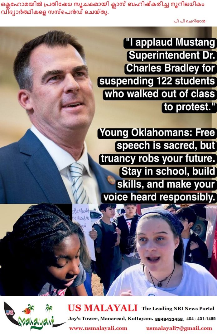 വിദ്യാർത്ഥികളെ സസ്പെൻഡ് ചെയ്ത സ്കൂൾ സൂപ്രണ്ടിന്റെ നടപടിയെ ഒക്ലഹോമ ഗവർണർ കെവിൻ സ്റ്റിറ്റ് പ്രശംസിച്ചു. അഭിപ്രായ സ്വാതന്ത്ര്യം പാവനമാണെങ്കിലും പഠനം ഉപേക്ഷിച്ചുള്ള പ്രതിഷേധം ശരിയല്ലെന്ന് ബുധനാഴ്ച അദ്ദേഹം എക്സിൽ കുറിച്ചു.