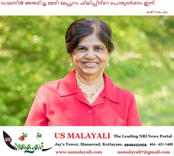 ഡാലസ്: കേരള അസോസിയേഷൻ ഓഫ് ഡാലസ് മുൻ വൈസ് പ്രസിഡന്റും, ബോർഡ് ഓഫ് ട്രസ്റ്റിസ് അംഗവുമായിരുന്ന പരേതനായ രാജൻ മേപ്പുറത്തിന്റെ സഹധർമ്മിണി ഡാലസിൽ അന്തരിച്ച മേരി മേപ്പുറം ഫിലിപ്പിന്റെ (ലില്ലിക്കുട്ടി 78) പൊതുദർശനം ഇന്ന് (വെള്ളി) വൈകിട്ട് 6.30 മുതൽ 8.30 വരെ ഡാലസ് കരോൾട്ടൺ മാർത്തോമ്മ ദേവാലയത്തിൽ (1400 W Frankford Rd, Carrollton, Tx 75007) വെച്ച് നടത്തപ്പെടും.