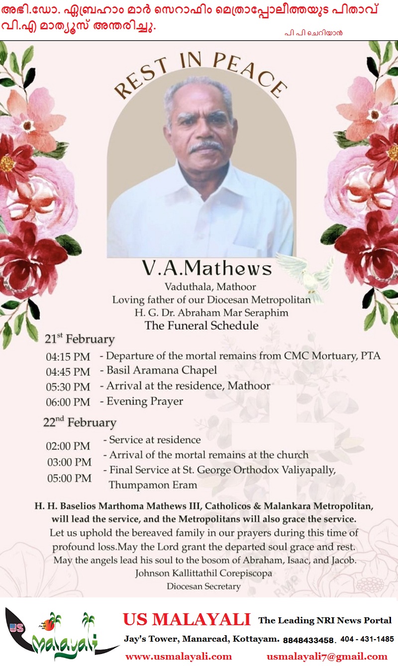 സംസ്ക്കാരം ഞായർ (22/02/2026 ) ഞായറഴ്ച 2 മണിക്ക് ഭവനത്തിലെ ശുശ്രൂഷയെ തുടർന്ന് തുമ്പമൺ ഏറം മാത്തൂർ സെന്റ്. ജോർജ് ഓർത്തഡോക്സ് വലിയ പള്ളിയിൽ പരിശുദ്ധ കാതോലിക്കാ ബാവാ തിരുമേനിയുടെ മുഖ്യ കർമികത്വത്തിൽ വൈകിട്ട് 5 മണിക്ക് നടത്തപ്പെടും.