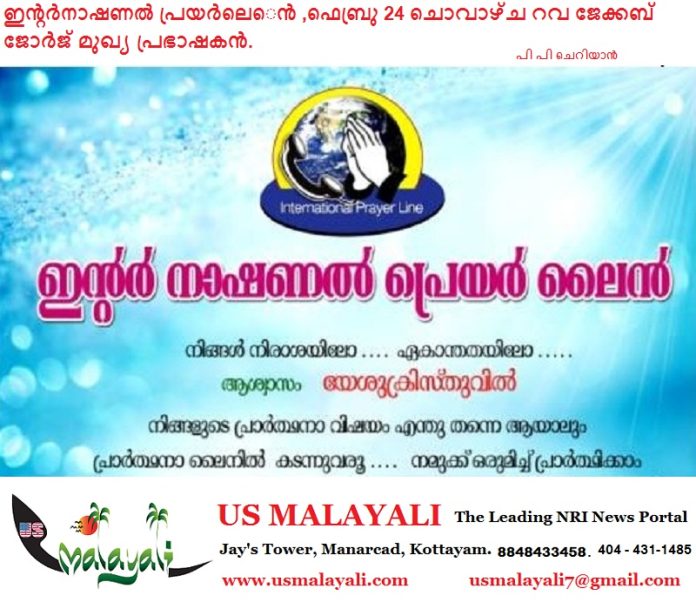വിവിധ രാജ്യങ്ങളിലുള്ളവർ എല്ലാ ആഴ്ചയിലും ഓൺലൈൻ പ്ലാറ്റുഫോമിൽ പ്രാർഥനയ്ക്കായി ഒത്തുചേരുന്ന പൊതുവേദിയാണ് ഇന്റർനാഷണൽ പ്രയർലെെൻ. എല്ലാ ചൊവ്വാഴ്ചയും രാത്രി ഒന്പതിനാണ്(ന്യൂയോർക്ക് ടൈം) പ്രയർലെെൻ സജീവമാകുന്നത്. ഫെബ്രു 24 ചൊവ്വാഴ്ചയിലെ പ്രയർലൈനിൽ റവ ജേക്കബ് ജോർജിന്റെ പ്രഭാഷണം ശ്രവിക്കുന്നതിനും അനുഗ്രഹം പ്രാപിക്കുന്നതിനും 712 770 4821എന്ന ഫോണ് നന്പർ ഡയൽചെയ്ത് 530464 എന്ന കോഡ് പ്രസ് ചെയ്യണമെന്ന് സംഘാടകർ അറിയിച്ചു.എല്ലാവരുടെയും പ്രാർത്ഥനാപൂർവ്വമായ പങ്കാളിത്തം സംഘാടകർ അഭ്യർത്ഥിച്ചു