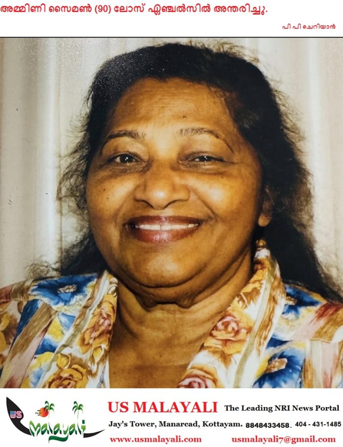 ലോസ് ഏഞ്ചൽസ് : അമ്മിണി സൈമൺ (90)കാലിഫോർണിയയിൽ അന്തരിച്ചു. ലോസ് ഏഞ്ചൽസിലുള്ള വസതിയിൽ ഫെബ്രുവരി 23 തിങ്കളാഴ്ച ഉച്ചയ്ക്ക് 12:00 മണിയോടെയാണ് അമ്മിണി മരണം സംഭവിച്ചത് .