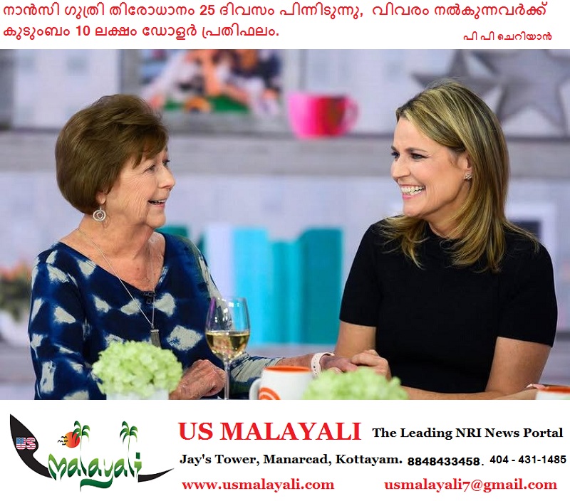 നാൻസിയെക്കുറിച്ച് വിവരം നൽകുന്നവർക്ക് കുടുംബം 1 മില്യൺ ഡോളർ (ഏകദേശം 8.3 കോടി രൂപ) പ്രതിഫലം പ്രഖ്യാപിച്ചു.