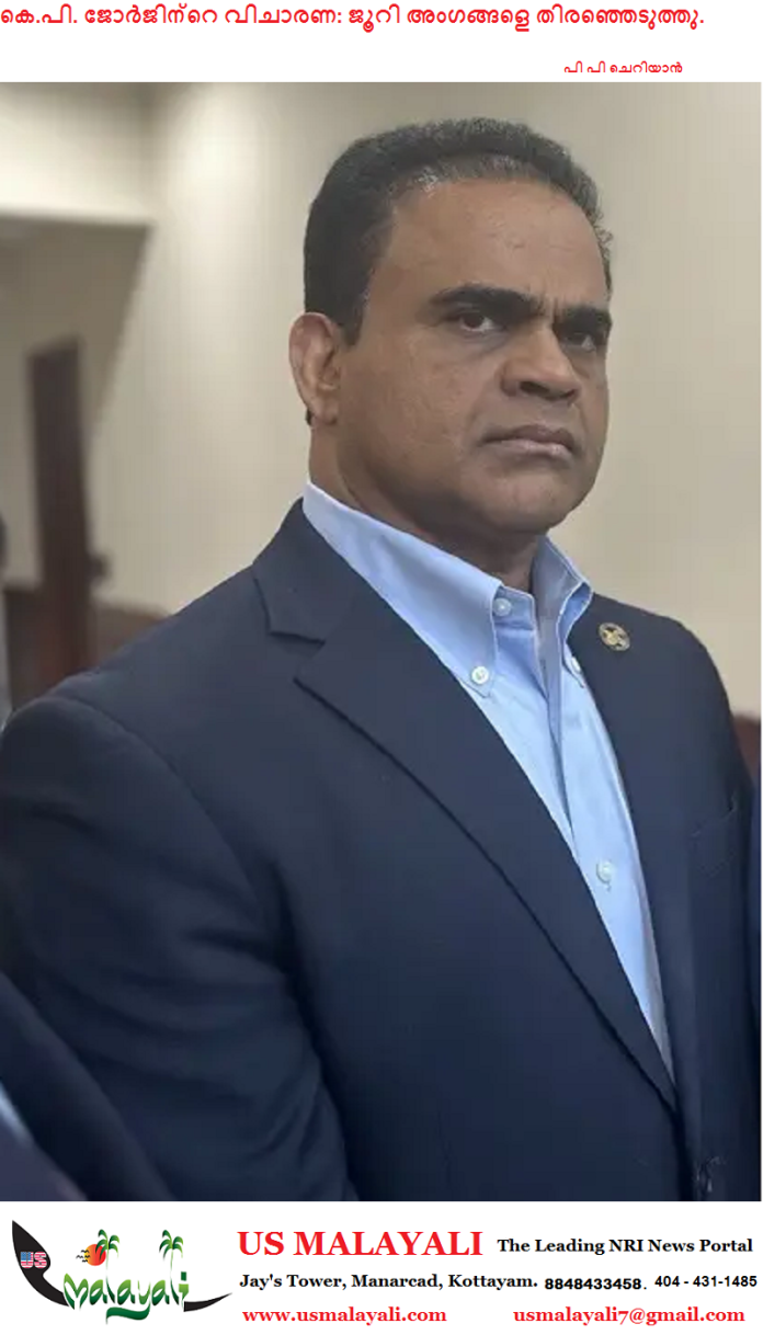 എഴുപതോളം പേരിൽ നിന്നാണ് ജൂറി അംഗങ്ങളെ കണ്ടെത്തിയത്. ഡെമോക്രാറ്റിക് പാർട്ടിയിൽ നിന്ന് റിപ്പബ്ലിക്കൻ പാർട്ടിയിലേക്ക് മാറിയ കെ.പി. ജോർജിന്റെ രാഷ്ട്രീയ നിലപാടുകളെക്കുറിച്ച് ചിലർ അതൃപ്തി പ്രകടിപ്പിച്ചെങ്കിലും നിഷ്പക്ഷരായ അംഗങ്ങളെ കണ്ടെത്താൻ അഭിഭാഷകർക്ക് സാധിച്ചു.