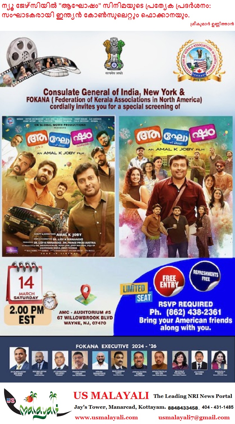 ന്യൂ ജേഴ്സി :ഇന്ത്യൻ കോൺസുലെറ്റ് ഇന്ത്യയിലെ വിവിധ ഭാഷകളിൽ ഉള്ള മൂവികളെയും പ്രൊമോട്ട് ചെയ്യുക എന്ന ലക്ഷ്യത്തോട് നടപ്പാക്കുന്ന പദ്ധതിയുടെ ഭാഗമായി ഫൊക്കാനയുമായി സഹകരിച്ചു “ആഘോഷം” സിനിമയുടെ പ്രത്യേക പ്രദർശനം സഘടപ്പിക്കുന്നു . ഈ അവസരത്തിൽ ഇന്ത്യൻ കോൺസുലെറ്റിലെ പ്രമുഖരും, ഫൊക്കാനായുടെ ഭാരവാഹികളും, അമേരിക്കയുടെ സാമുഖ്യ സംസ്കരിക രംഗത്തെ പ്രമുഖരും പങ്കെടുക്കും. ഇന്ത്യക്കാരോടൊപ്പം അമേരിക്കയിലെ വിവിധ സാമുഖ്യ പ്രവർത്തകരുടെ ഇടയിലേക്കും നമ്മുടെ വിവിധ ഭാഷാമൂവികൾ പ്രചരിപ്പിക്കുക എന്നത് കൂടിയാണ് ഇന്ത്യൻ കോൺസുലെറ്റ് ലക്ഷ്യം വെക്കുന്നത്. അതിന്റെ ഭാഗമായാണ് “ആഘോഷം” സിനിമയുടെ പ്രത്യേക പ്രദർശനം നടത്തുന്നത്.