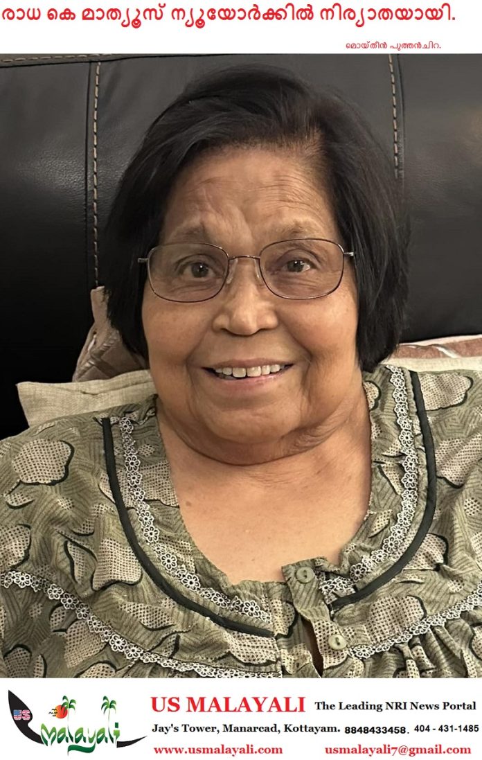 ന്യൂയോര്ക്ക്: ന്യൂയോര്ക്ക് ഫ്ലോറല് പാര്ക്ക് നിവാസിയും റിട്ട. രജിസ്റ്റേർഡ് നഴ്സുമായ രാധ കെ. മാത്യൂസ് ഫ്ലോറല് പാര്ക്കില് നിര്യാതയായി. ദീര്ഘകാലം ന്യൂയോര്ക്ക് ആല്ബനി നിവാസിയായിരുന്നു പരേത.