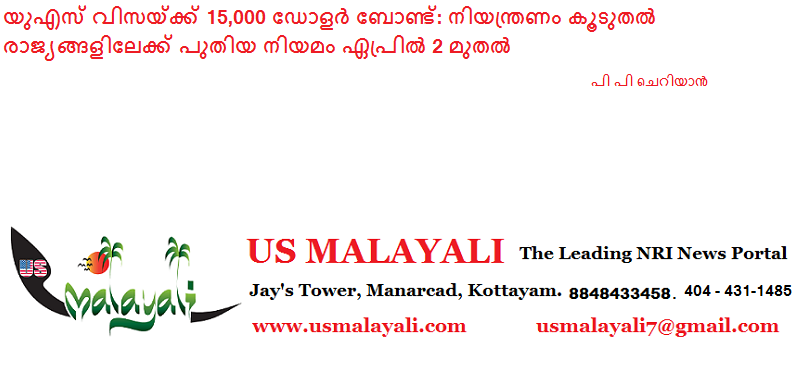 വാഷിംഗ്ടൺ ഡി സി : അമേരിക്കൻ വിസ ലഭിക്കുന്നതിന് 15,000 ഡോളർ (ഏകദേശം 12.5 ലക്ഷം രൂപ) ബോണ്ട് തുകയായി കെട്ടിവെക്കണമെന്ന നിബന്ധന 12 രാജ്യങ്ങളിലേക്ക് കൂടി വ്യാപിപ്പിക്കാൻ ട്രംപ് ഭരണകൂടം തീരുമാനിച്ചു. ഇതോടെ ആകെ 50 രാജ്യങ്ങളിലെ പൗരന്മാർക്ക് ഈ നിയന്ത്രണം ബാധകമാകും.