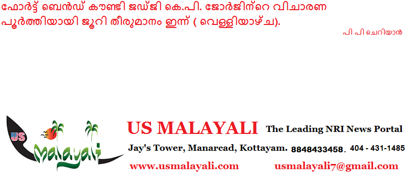 ഹൂസ്റ്റൺ :ഫോർട്ട് ബെൻഡ് കൗണ്ടി ജഡ്ജി കെ.പി. ജോർജ് പ്രതിയായ പണം വെളുപ്പിക്കൽ കേസിൽ വിചാരണ പൂർത്തിയായി. വ്യാഴാഴ്ച ഉച്ചയോടെ കേസ് വിധി പറയാനായി ജൂറിയുടെ പരിഗണനയ്ക്ക് വിട്ടു. വെള്ളിയാഴ്ച രാവിലെ ജൂറി വീണ്ടും യോഗം ചേർന്ന് അന്തിമ തീരുമാനമെടുക്കും.
