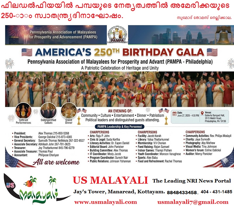 ഫിലഡൽഫിയ: പെൻസിൽവാനിയ അസോസിയേഷൻ ഓഫ് മലയാളീസ് ഫോർ പ്രോസ്പെരിറ്റി ആൻഡ് അഡ്വാൻസ്മെന്റ് (PAMPA Philadelphia)യുടെ ആഭിമുഖ്യത്തിൽ അമേരിക്കയുടെ 250-ാം സ്വാതന്ത്ര്യദിനാഘോഷത്തോടനുബന്