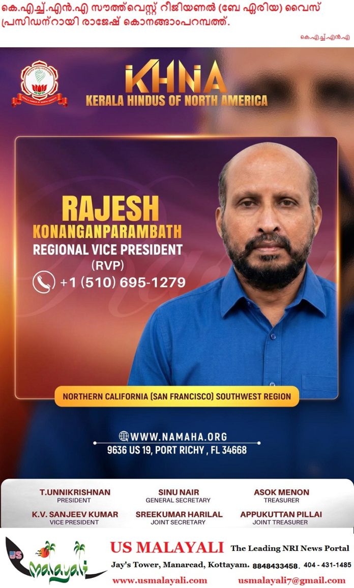 സാൻ ഫ്രാൻസിസ്കോ : നോർത്ത് അമേരിക്കയിലെ മലയാളി ഹിന്ദുക്കളുടെ ദേശീയ സംഘടനയായ Kerala Hindus of North America (KHNA)യുടെ സൗത്ത്വെസ്റ്റ് റീജിയണൽ വൈസ് പ്രസിഡന്റായി (RVP) രാജേഷ് കൊനങ്ങാംപറമ്പത്തിനെ നിയമിച്ചു. സാൻ ഫ്രാൻസിസ്കോ ഉൾപ്പെടുന്ന നോർതേൺ കാലിഫോർണിയ മേഖലയിൽ സംഘടനയുടെ പ്രവർത്തനങ്ങൾ ഏകോപിപ്പിക്കുകയും സാമൂഹിക–സാംസ്കാരിക പദ്ധതികൾക്ക് നേതൃത്വം നൽകുകയും ചെയ്യുന്നതാണ് അദ്ദേഹത്തിന്റെ പ്രധാന ചുമതല.