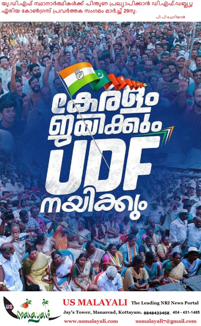 ഡാളസ്: കേരളത്തിൽ വരാനിരിക്കുന്ന നിയമസഭാ തിരഞ്ഞെടുപ്പിൽ യു.ഡി.എഫ് സ്ഥാനാർത്ഥികൾക്ക് പ്രവാസികളുടെ പൂർണ്ണ പിന്തുണ ഉറപ്പാക്കുന്നതിനും സമകാലിക രാഷ്ട്രീയ സാഹചര്യങ്ങൾ ചർച്ച ചെയ്യുന്നതിനുമായി ഇന്ത്യൻ നാഷണൽ കോൺഗ്രസ് ഡി.എഫ്.ഡബ്ല്യു ഏരിയ പ്രവർത്തക യോഗം സംഘടിപ്പിക്കുന്നു.