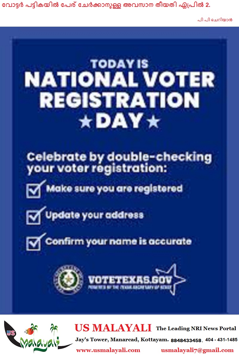 റിച്ചാർഡ്സൺ (ടെക്സസ്) : മെയ് 2-ന് നടക്കുന്ന റിച്ചാർഡ്സൺ ബോണ്ട്, ചാർട്ടർ തിരഞ്ഞെടുപ്പുകളിൽ പങ്കാളികളാകാൻ വോട്ടർ പട്ടികയിൽ പേര് ചേർക്കുന്നതിനുള്ള സമയം അവസാനിക്കുന്നു.അവസാന തീയതി ഏപ്രിൽ 2, വ്യാഴാഴ്ചയാണ്
