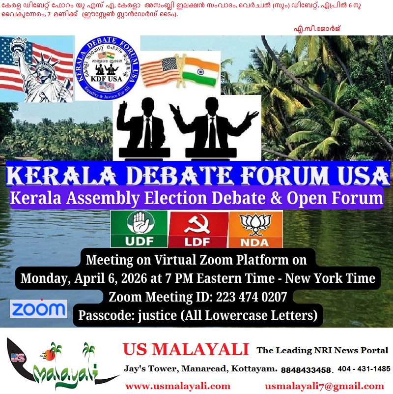 ഹ്യൂസ്റ്റൺ: ചൂടേറിയ കേരളാ അസംബ്ലി തെരഞ്ഞെടുപ്പ് പ്രചാരണങ്ങൾ തിരുതകൃതിയായി നടക്കുന്ന ഈ അവസരത്തിൽ, താല്പര്യമുള്ള അമേരിക്കൻ മലയാളികൾക്കായി കേരള ഡിബേറ്റ് ഫോറം യു എസ് എ, ആഭിമുഖ്യത്തിൽ, വിജ്ഞാനപ്രദവും രാഷ്ട്രീയ ബോധവൽക്കരണത്തിന് ഉതകുന്നതുമായ ഇലക്ഷൻ (സും) ഡിബേറ്റ്, ഏപ്രിൽ 6, 2026 തിങ്കൾ വൈകുന്നേരം 7 മണി (ഈസ്റ്റേൺ സ്റ്റാൻഡേർഡ് ടൈം – ന്യൂയോർക്ക് ടൈം) സംഘടിപ്പിക്കുന്നു.