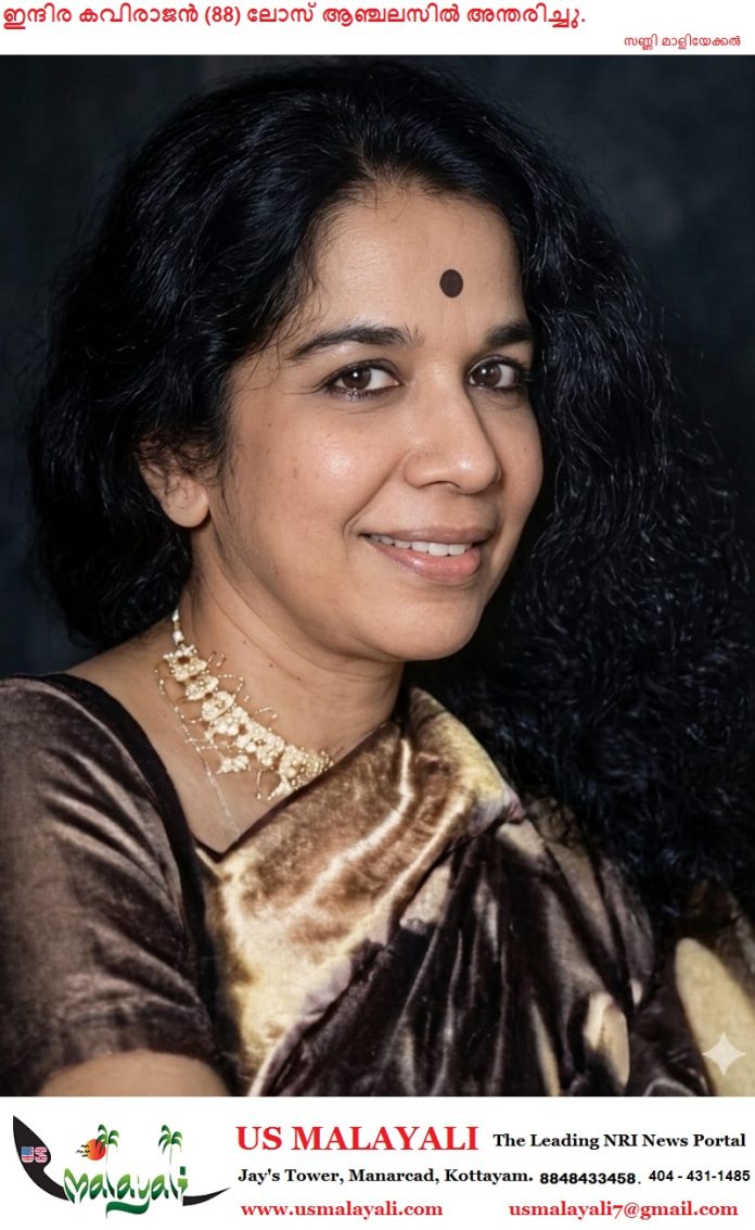 ലോസ് ആഞ്ചലസ്: ഡോ. കവിരാജന്റെ ധർമ്മപത്നി ശ്രീമതി. ഇന്ദിര കവിരാജൻ നിര്യാതയായി. 1965 മുതൽ അമേരിക്കയിലെ ലോസ് ആഞ്ചലസിൽ താമസിച്ചുവരികയായിരുന്നു.