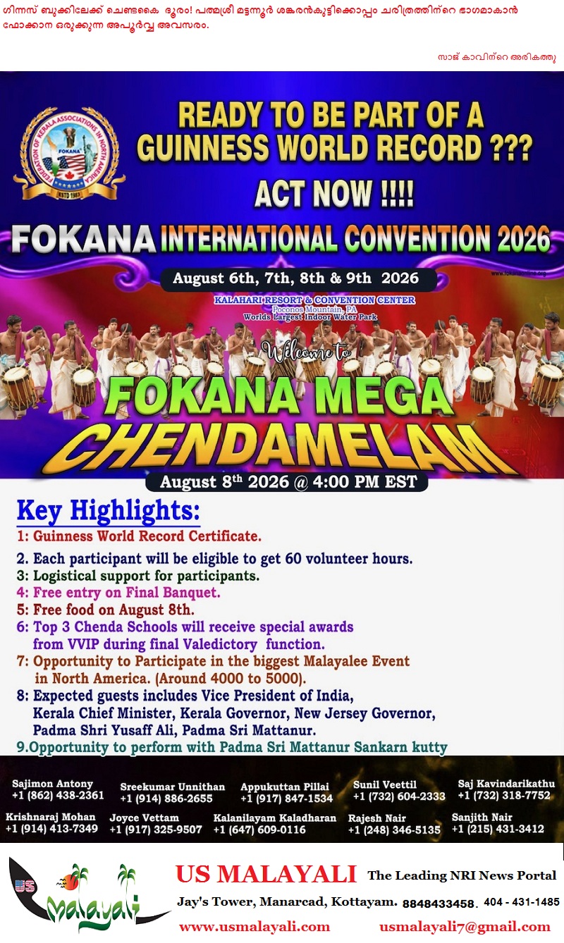 ന്യൂജേഴ്സി: ചെണ്ടയുടെ ഓരോ കൊട്ടും വെറുമൊരു താളമല്ല, അത് പ്രവാസിയുടെ അതിജീവനത്തിന്റെയും മണ്ണിലെ വേരുകളുടെയും ഉശിരുള്ള മുഴക്കമാണ്. ഫൊക്കാന (FOKANA) ഇന്റർനാഷണൽ ഫാമിലി കൺവെൻഷൻ 2026-ന്റെ ഭാഗമായി ഓഗസ്റ്റ് 8-ന് പെൻസിൽവേനിയയിലെ കലഹാരി റിസോർട്ടിൽ അരങ്ങേറുന്ന “പഞ്ചാരി മേളം ” വെറുമൊരു ഗിന്നസ് വേൾഡ് റെക്കോർഡ് ശ്രമമല്ല; മറിച്ച് ലോകമെമ്പാടുമുള്ള മലയാളികളെ ഒരേ താളത്തിൽ കോർത്തിണക്കുന്ന ഒരു മഹാസംഗമമാണ്.