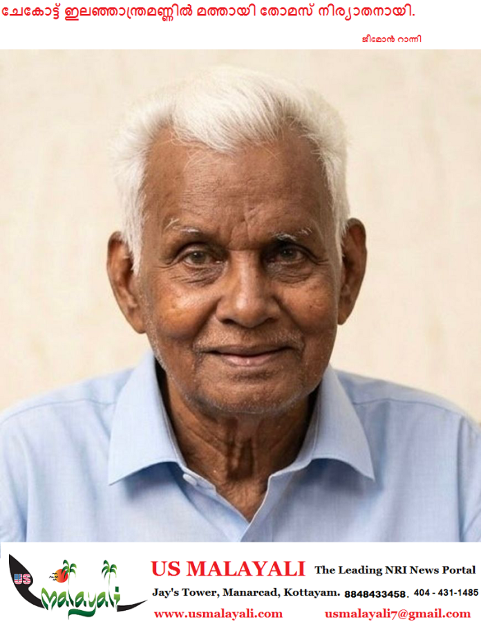 ഹൂസ്റ്റൺ: റാന്നി:ഈട്ടിച്ചുവട് എബനേസർ എച്ച്എസ് റിട്ട. അധ്യാപകൻ ഈട്ടിച്ചുവട് ചേകോട്ട് ഇലഞ്ഞാന്ത്രമണ്ണിൽ (പേരങ്ങാട്ട് കുടുംബം) മത്തായി തോമസ് (ബേബിസാർ -91) അന്തരിച്ചു.സംസ്കാര ശുശ്രൂഷകൾ: ഭൗതിക ശരീരം ഏപ്രിൽ 4 നു ശനിയാഴ്ച രാവിലെ 7 മണിക്ക് ഭവനത്തിൽ കൊണ്ടുവരുന്നതും ശേഷം 12 മണിക്ക് സംസ്കാര ശുശ്രൂഷ പൂഴിക്കുന്ന് ഐ.പി.സി എബനേസർ ചർച്ചിന്റെ നേതൃത്വത്തിൽ നടത്തപെടുന്നതുമാണ്.