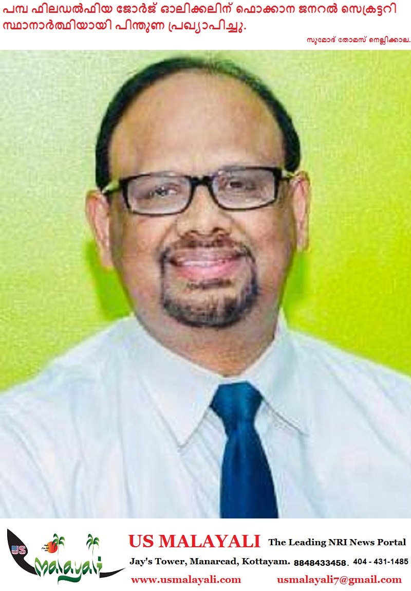 ഫിലഡൽഫിയ: പമ്പ മലയാളി അസോസിയേഷൻ (Pennsylvania Association of Malayalees for Prosperity and Advancement), ഫൊക്കാന (FOKANA) ജനറൽ സെക്രട്ടറി സ്ഥാനത്തേക്ക് മത്സരിക്കുന്ന ജോർജ് ഓലിക്കലിന് ഔദ്യോഗിക പിന്തുണ പ്രഖ്യാപിച്ചു. ലീലയ മാരറ്റ് നയിക്കുന്ന “ടീം എംപവർ” പാനലിന്റെ സ്ഥാനാർത്ഥിയായാണ് ജോർജ് ഓലിക്കൽ തിരഞ്ഞെടുപ്പിനെ നേരിടുന്നത്.