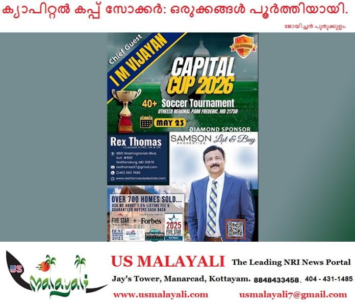 വാഷിംഗ്ടൺ ഡിസി: മേരിലാൻഡ് സ്ട്രൈക്കേഴ്സ് മെമ്മോറിയൽ വീക്കെൻഡായ മെയ് 23 ന് നടത്തുന്ന മൂന്നാമത് നോർത്ത് അമേരിക്കൻ ക്യാപിറ്റൽ കപ്പ് സോക്കർ ടൂർണമെന്റിനുള്ള ഒരുക്കങ്ങൾ പൂർത്തിയായതായി സംഘാടകർ അറിയിച്ചു .