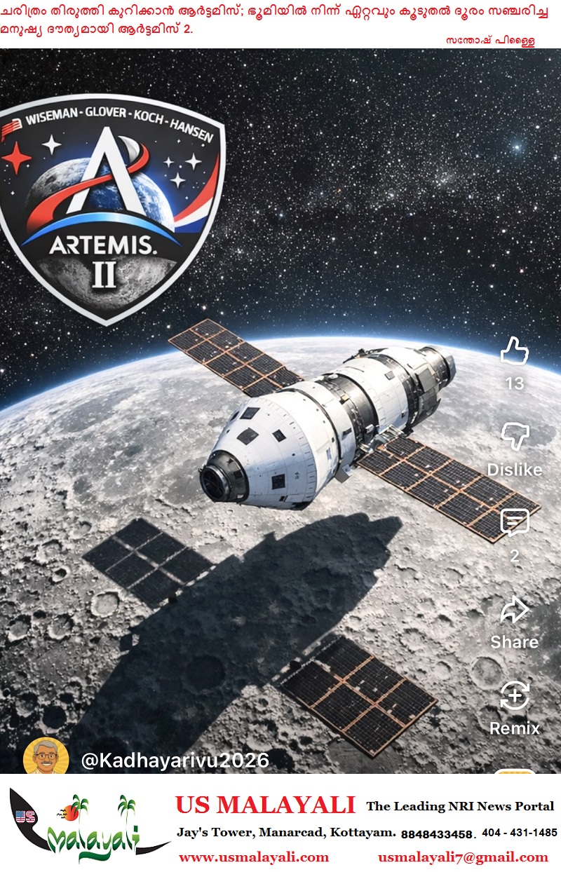 ദൂരത്തിന്റെ റെക്കോർഡ് ഭേദിച്ച് ആർട്ടമിസ് 2മനുഷ്യരില്ലാത്ത ആദ്യ ദൗത്യമായ ആർട്ടമിസ് 1, 2022-ൽ ഭൂമിയിൽ നിന്നും 2,70,000 മൈൽ ദൂരത്തിൽ എത്തിയിരുന്നു. എന്നാൽ ഇപ്പോൾ ബഹിരാകാശ സഞ്ചാരികളുമായി യാത്ര തിരിക്കുകയും തിരികെ വരികയും ചെയ്യുന്ന ആർട്ടമിസ് 2, ഭൂമിയിൽ നിന്നും 2,52,760 മൈൽ ദൂരം പിന്നിട്ടിരിക്കുകയാണ്. ഭൂമിയിൽ നിന്നും മനുഷ്യർ ഇതുവരെ സഞ്ചരിച്ചിട്ടുള്ളതിൽ വച്ച് ഏറ്റവും കൂടുതൽ ദൂരമാണിത്. 1960 മുതൽ 1972 വരെ നീണ്ടുനിന്ന അപ്പൊളോ ദൗത്യങ്ങൾക്ക് ശേഷമുള്ള വലിയൊരു മുന്നേറ്റമാണിത്.ചന്ദ്രന്റെ മറുപുറത്തെ കാഴ്ചകൾആർട്ടമിസ് 2-ലെ ഓറിയോൺ പേടകം ചന്ദ്രന്റെ മറുഭാഗത്ത് നിന്നും പകർത്തിയ ചിത്രങ്ങൾ ശാസ്ത്രലോകത്തെ അത്ഭുതപ്പെടുത്തിയിരിക്കുകയാണ്. ഭൂമിയിലെ രാവും പകലും, സൂര്യഗ്രഹണം, ചന്ദ്രോപരിതലത്തിലെ ഗർത്തങ്ങൾ എന്നിവയെല്ലാം അതിശയിപ്പിക്കുന്ന വ്യക്തതയോടെയാണ് ഈ ചിത്രങ്ങളിൽ കാണാൻ സാധിക്കുന്നത്.