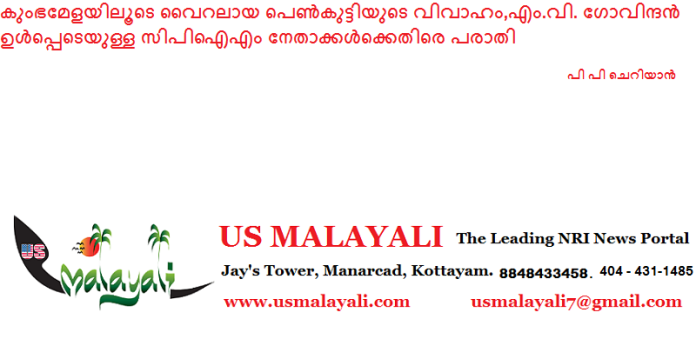 തിരുവനന്തപുരം: കുംഭമേളയിലൂടെ വൈറലായ പെൺകുട്ടിയുടെ വിവാഹം നടത്തിക്കൊടുക്കാൻ കൂട്ടുനിന്നു എന്നാരോപിച്ച് സിപിഐഎം ഉന്നത നേതാക്കൾക്കെതിരെ പോലീസിൽ പരാതി. സിപിഐഎം സംസ്ഥാന സെക്രട്ടറി എം.വി. ഗോവിന്ദൻ, മന്ത്രി വി. ശിവൻകുട്ടി, എ.എ. റഹീം എംപി എന്നിവർക്കെതിരെ നടപടി വേണമെന്ന് ആവശ്യപ്പെട്ട് യൂത്ത് കോൺഗ്രസ് കുന്നംകുളം നിയോജകമണ്ഡലം വൈസ് പ്രസിഡന്റ് വിഘ്നേശ്വര പ്രസാദാണ് പരാതി നൽകിയത്.